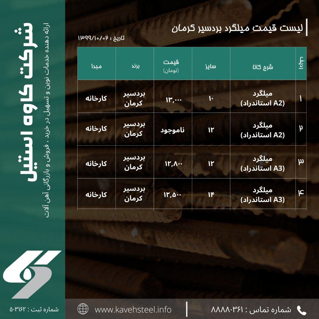 📌لیست قیمت #میلگرد(بردسیر کرمان) - کارخانه 🗓تاریخ : ۱۳۹۹/۱۰/۰۲ شماره های تماس : 📞 02188880361 📞02188780310 @steel_kaveh
