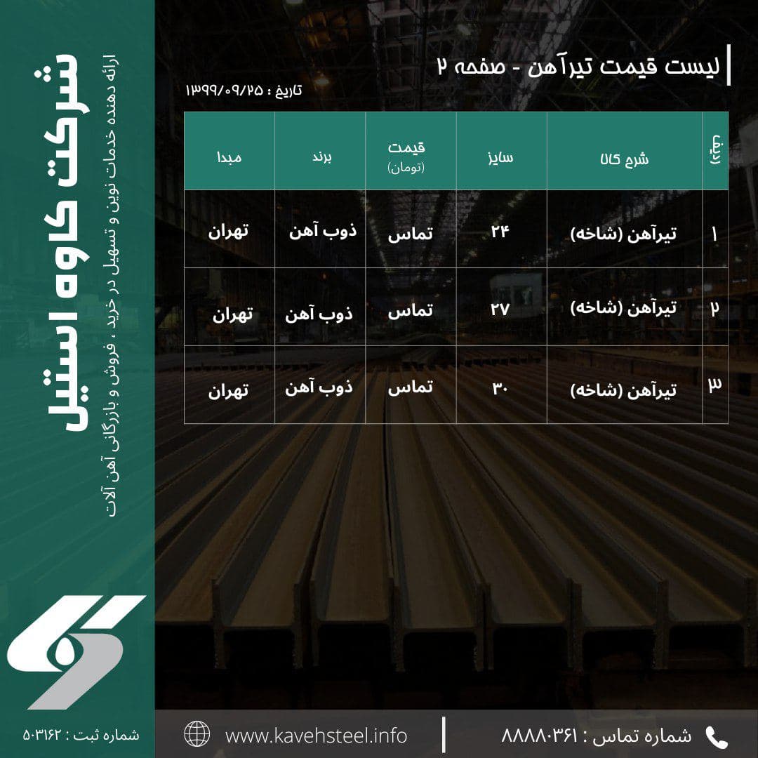 [ Photo ] 📌لیست قیمت #تیرآهن (ذوب آهن) - تهران 🗓تاریخ : ۱۳۹۹/۰۹/۲۵ شماره های تماس : 📞 02188880361 📞02188780310 @steel_kaveh