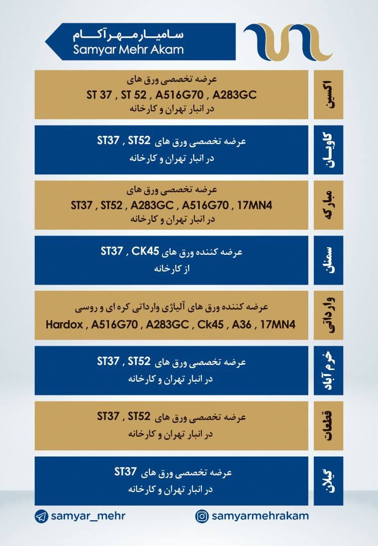 #سامیار_مهر_آکام 🔱عرضه کننده تخصصی ورق فولادی(سیاه)🔱 ❇️اکسین/مبارکه/کاویان/خرم آباد ❇️قطعات/هاردوکس/گیلان 📱0912 185 7358 ☎️021 66136431 🆔@samyar_mehr https: ...
