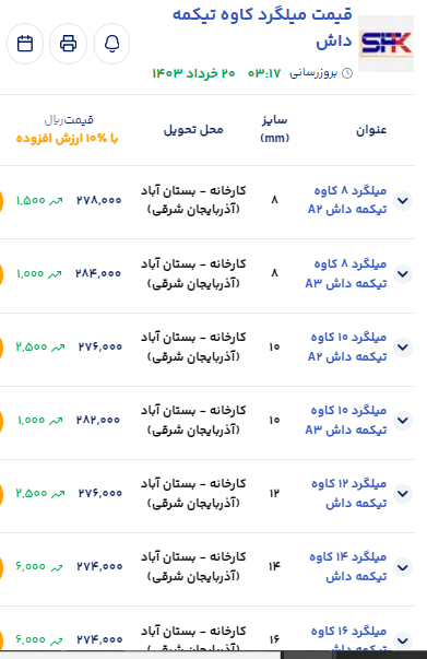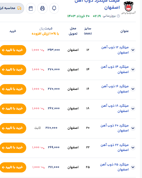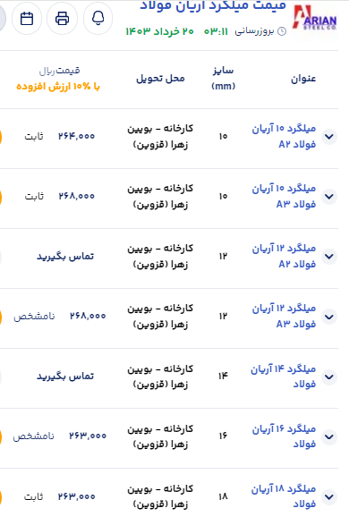 ااعلام موجودی اصفهان آهن میلگرد آریان فولاد