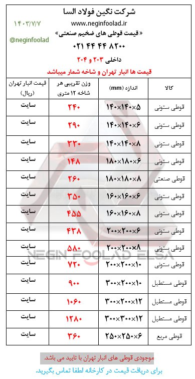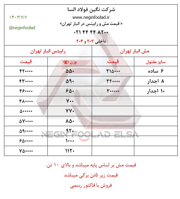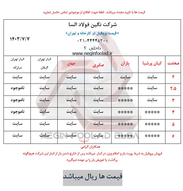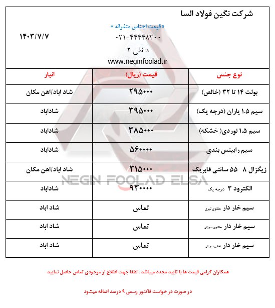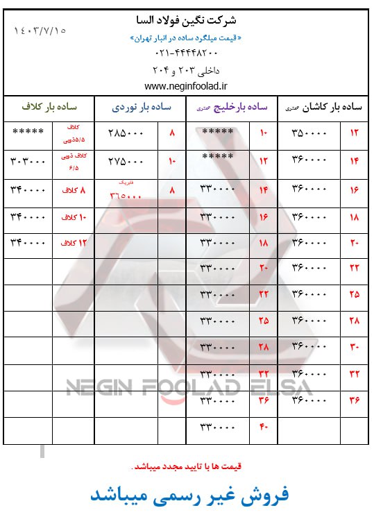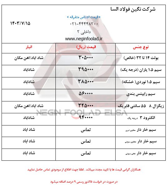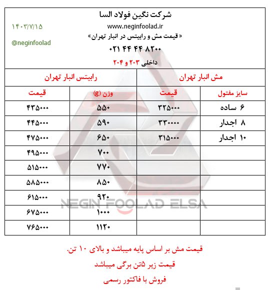 بشی ۳ گوشت ۳ شکفته ⬅️ ۳۵۲۰۰ نبشی ۵ آریان فولاد ⬅️ ۳۴۶۰۰ نبشی ۶ آریان فولاد ⬅️ ۳۴۶۰۰ نبشی ۸ آریان فولاد ⬅️ ۳۴۶۰۰ نبشی ۱۰ آریان فولاد ⬅️ ۳۴۷۰۰ نبشی ۱۲ آریان فولاد ⬅️ ۳۴۷۰۰