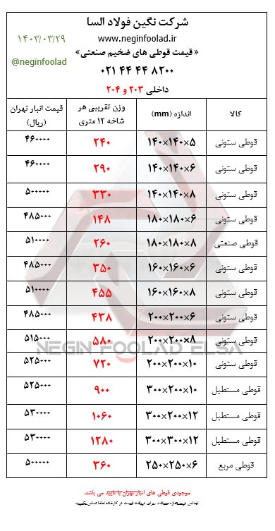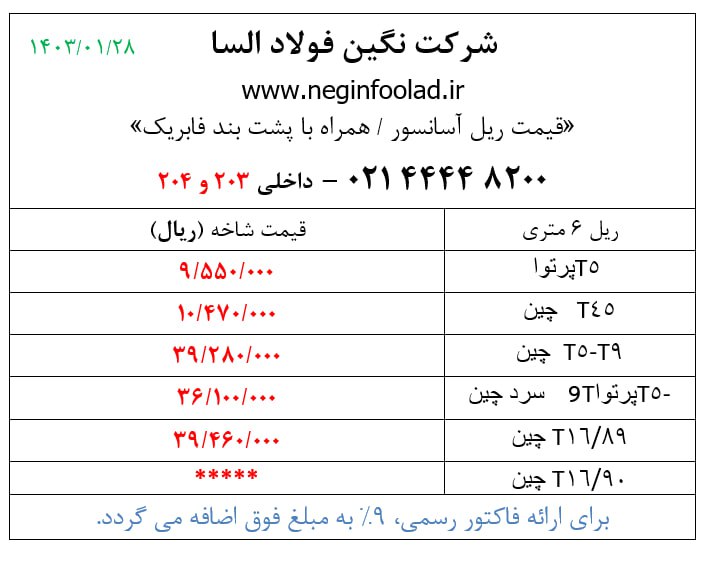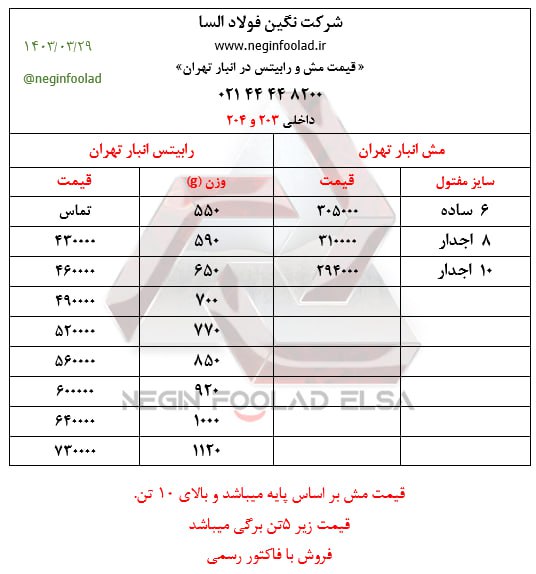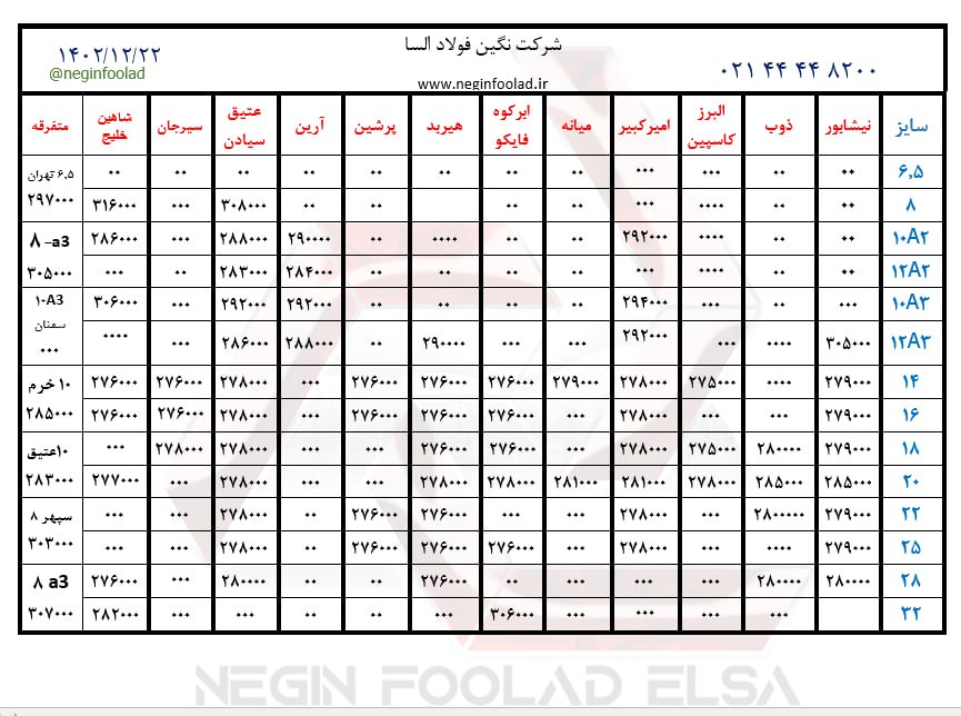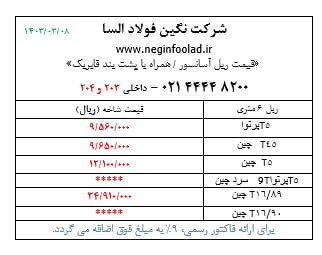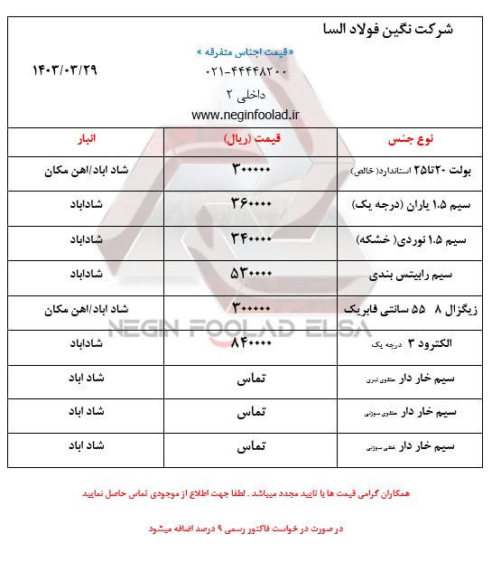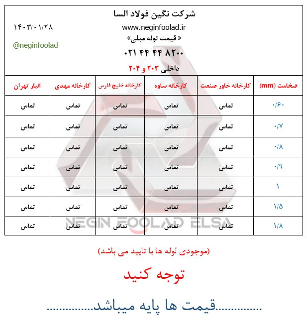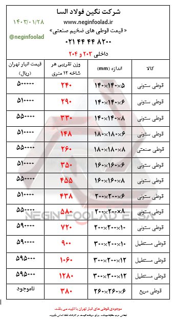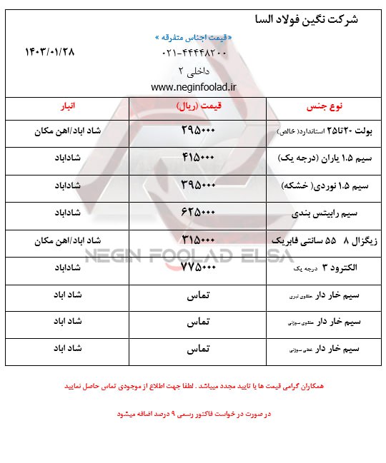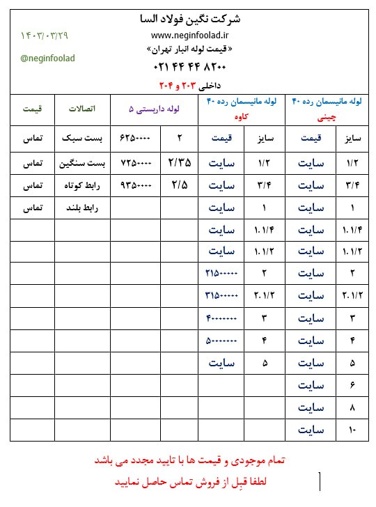 قیمت های لوله لوله مبلی پروفیل پروفیل صنعتی متفرقه رابیتس میلگرد ساده میلگرد صادراتی به روز شدند 😍 برای مشاهده قیمتها به وب سایت شرکت رجوع کنید . NeginFoolad ...