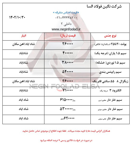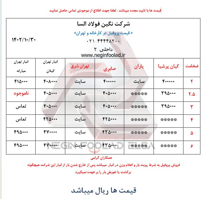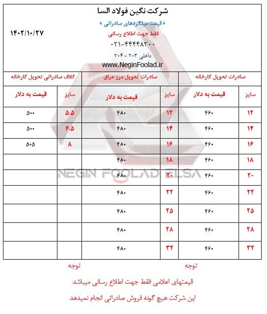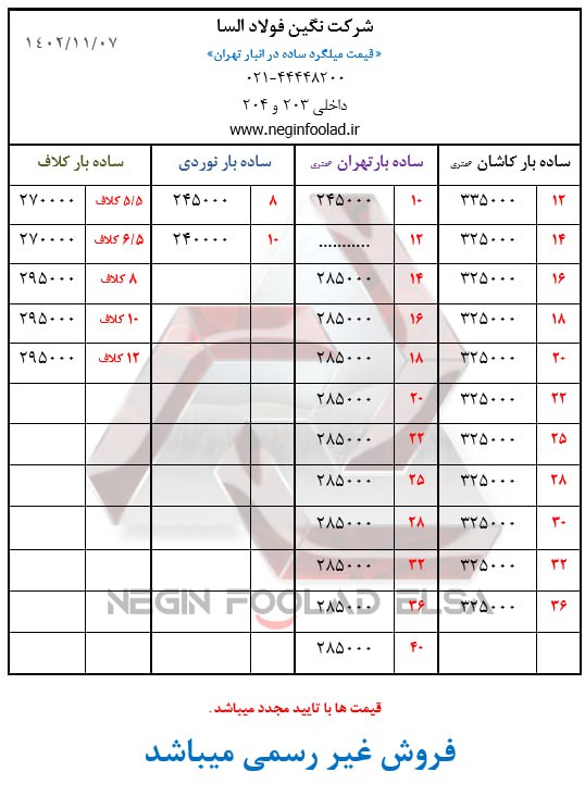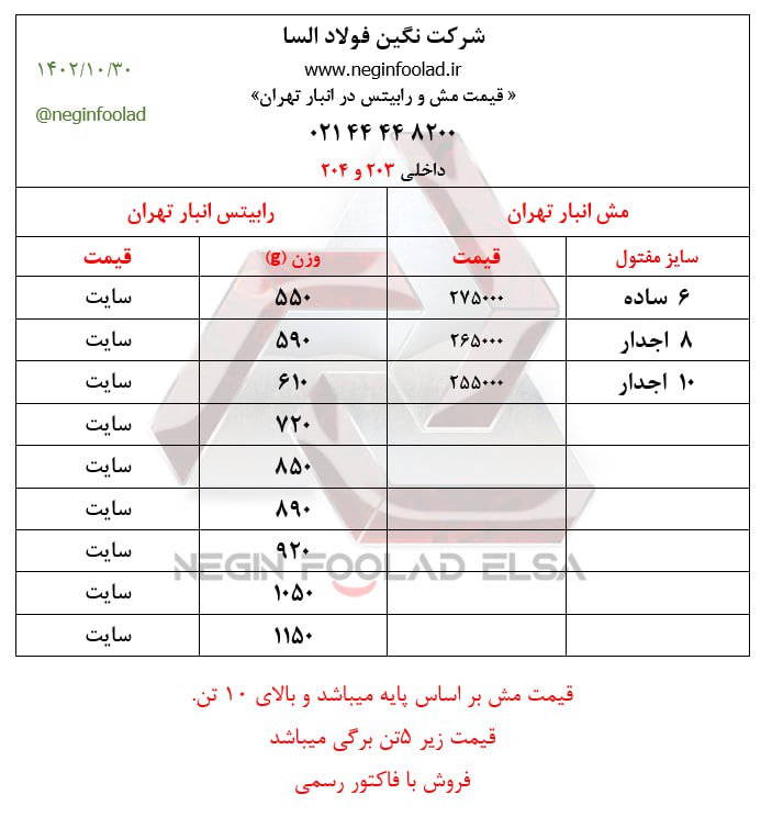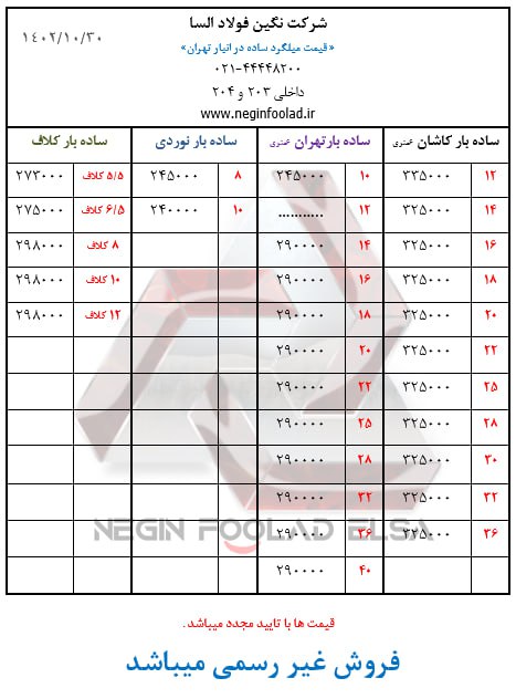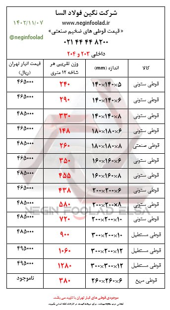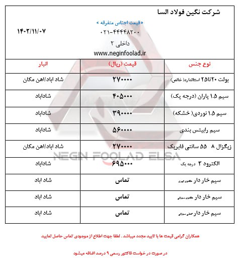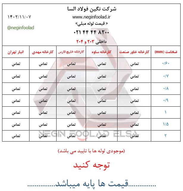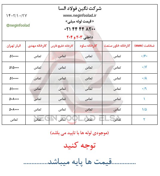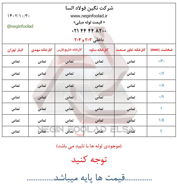 قیمت های لوله لوله مبلی پروفیل پروفیل صنعتی متفرقه رابیتس میلگرد ساده میلگرد صادراتی به روز شدند 😍 برای مشاهده قیمتها به وب سایت شرکت رجوع کنید . NeginFoolad ...