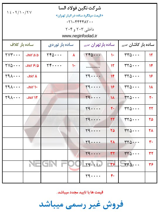 لیست میلگرد فروش ویژه در انبارتهران 10 آرینa3—— زرد —-1بندل—- 28000 12 آرین a3 ——زرد——1بندل—— 28000 18 فایکو ——— ...