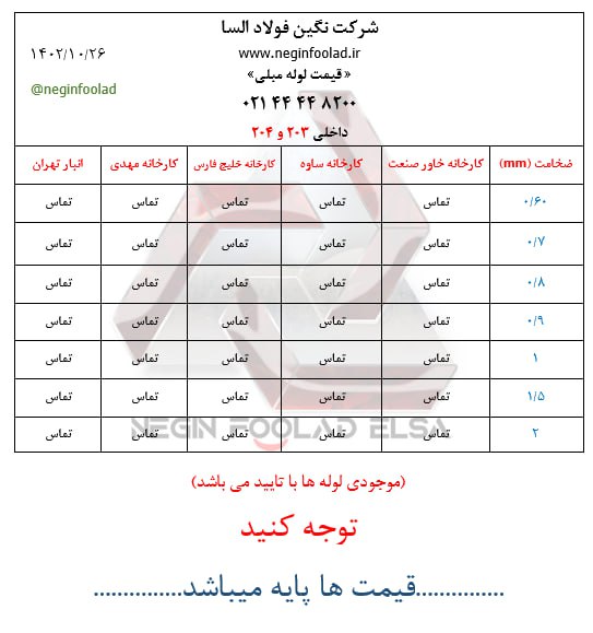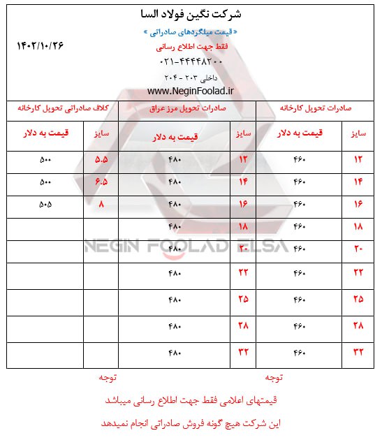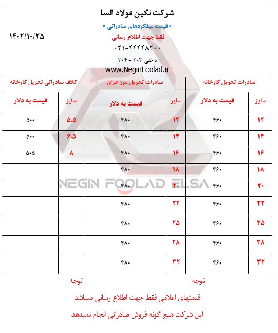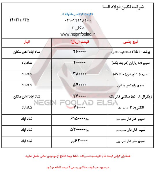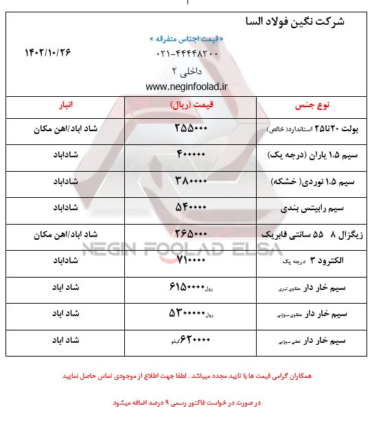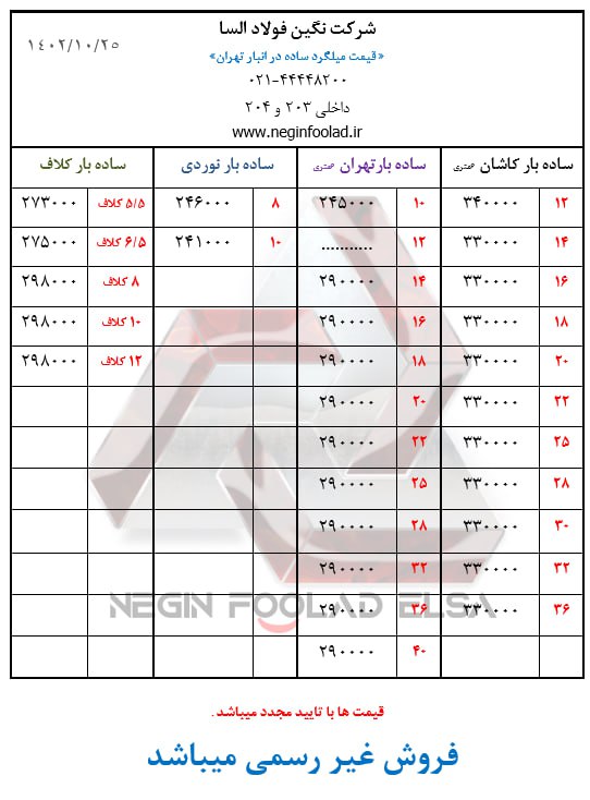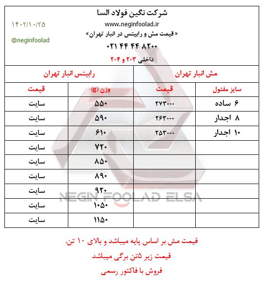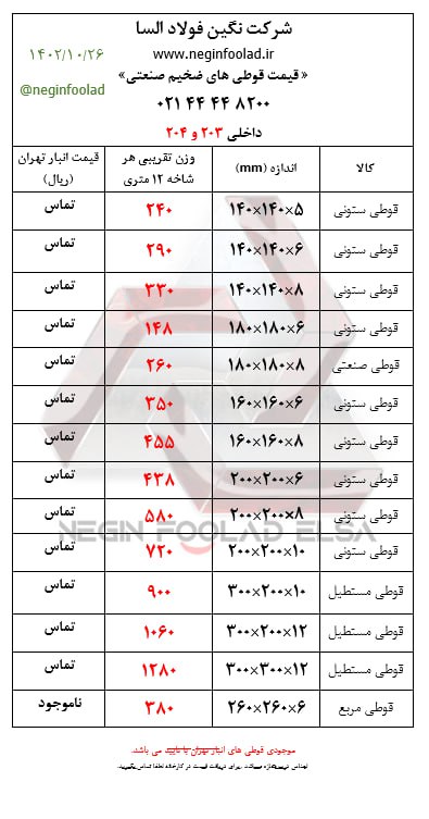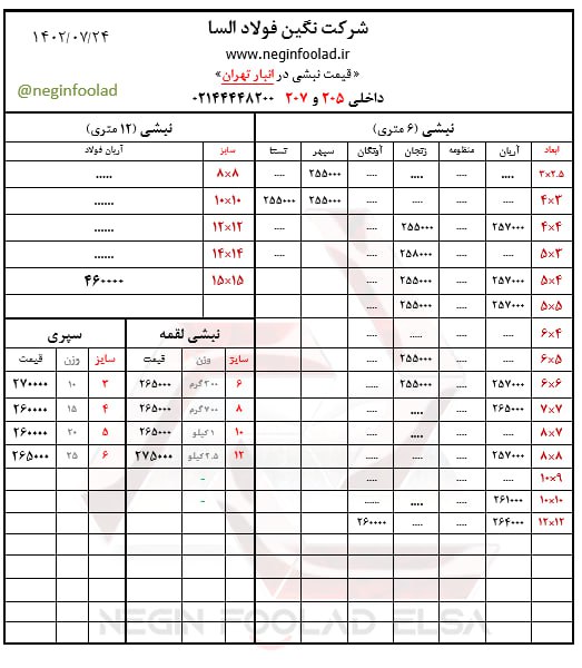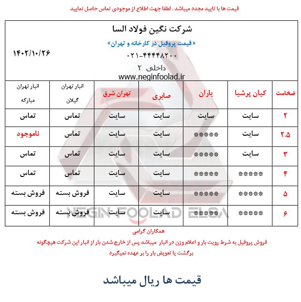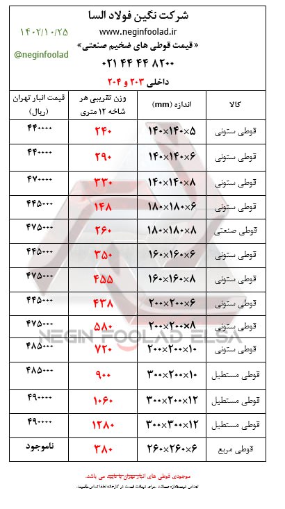 باسلام قیمتهای امروز تیرآهن اعلام شد همکاران محترم میتوانند جهت مشاهده قیمت لحظه ای انواع تیر آهن در انبار تهران به سایت نگین فولاد السا مراجعه نمایند د ...