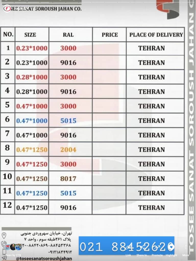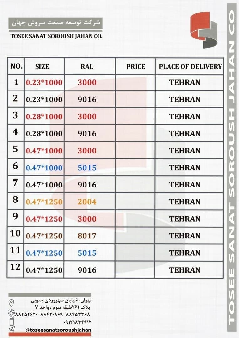 #توسعه_صنعت_سروش_جهان ⬅️وارد کننده و عرضه کننده ورق های رنگی #ورق_رنگی 📞۸۸۴۵۲۶۲۰ 📞۸۸۴۵۳۳۶۸ 📞۸۸۴۲۰۸۶۹ 📱۰۹۱۲۱۸۳۴۹۱۲ @toseesanatsoroushjahan https://foolad24.co ...