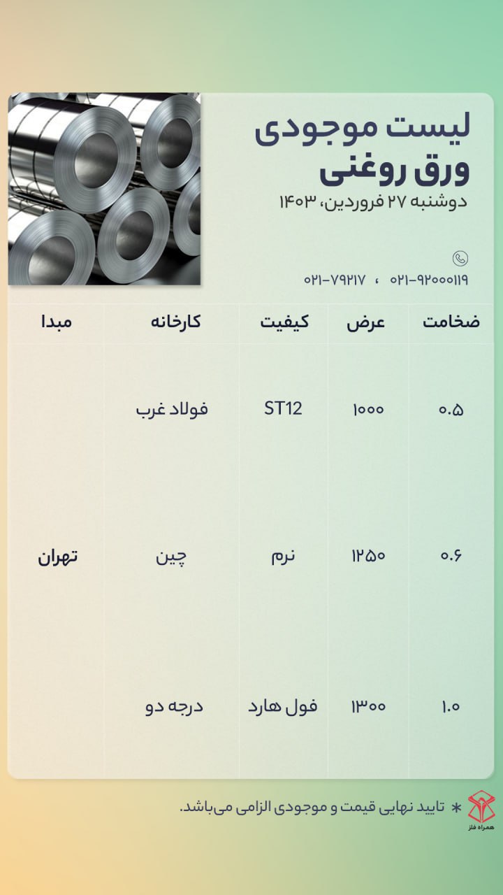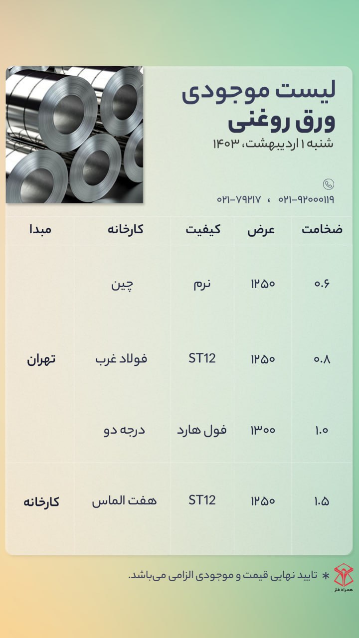 ⚜️#همراه_فلز_آسیا ⚜️ ❇️تهیه و تامین انواع ورق های فولاد ی و استیل 💠ورق روغنی 💠ورق سیاه 💠ورق گالوانیزه 💠انواع مقاطع طویل (تیر آهن و میلگرد و نبشی و ناودانی و ...