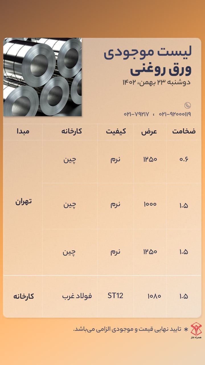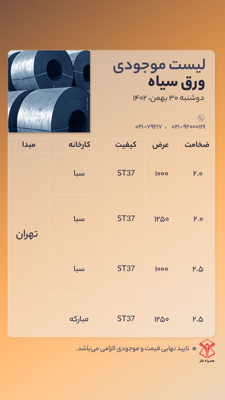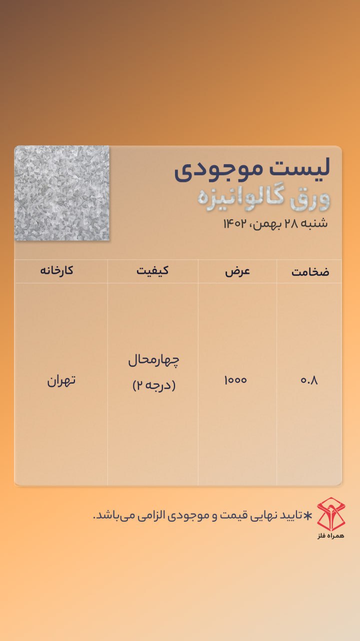 اعلام موجودی ورق گالوانیزه