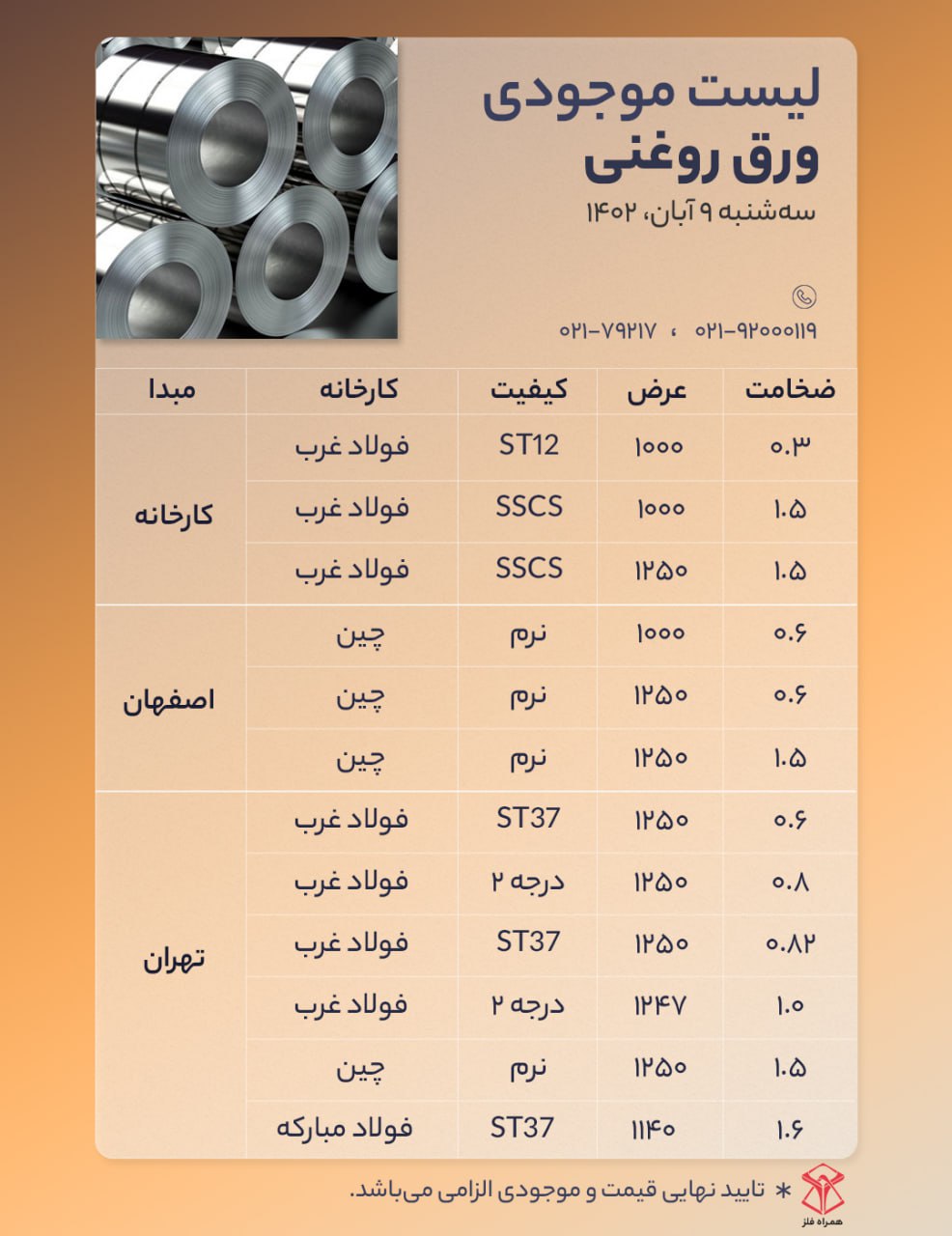 اعلام موجودی ورق گالوانیزه و رنگی