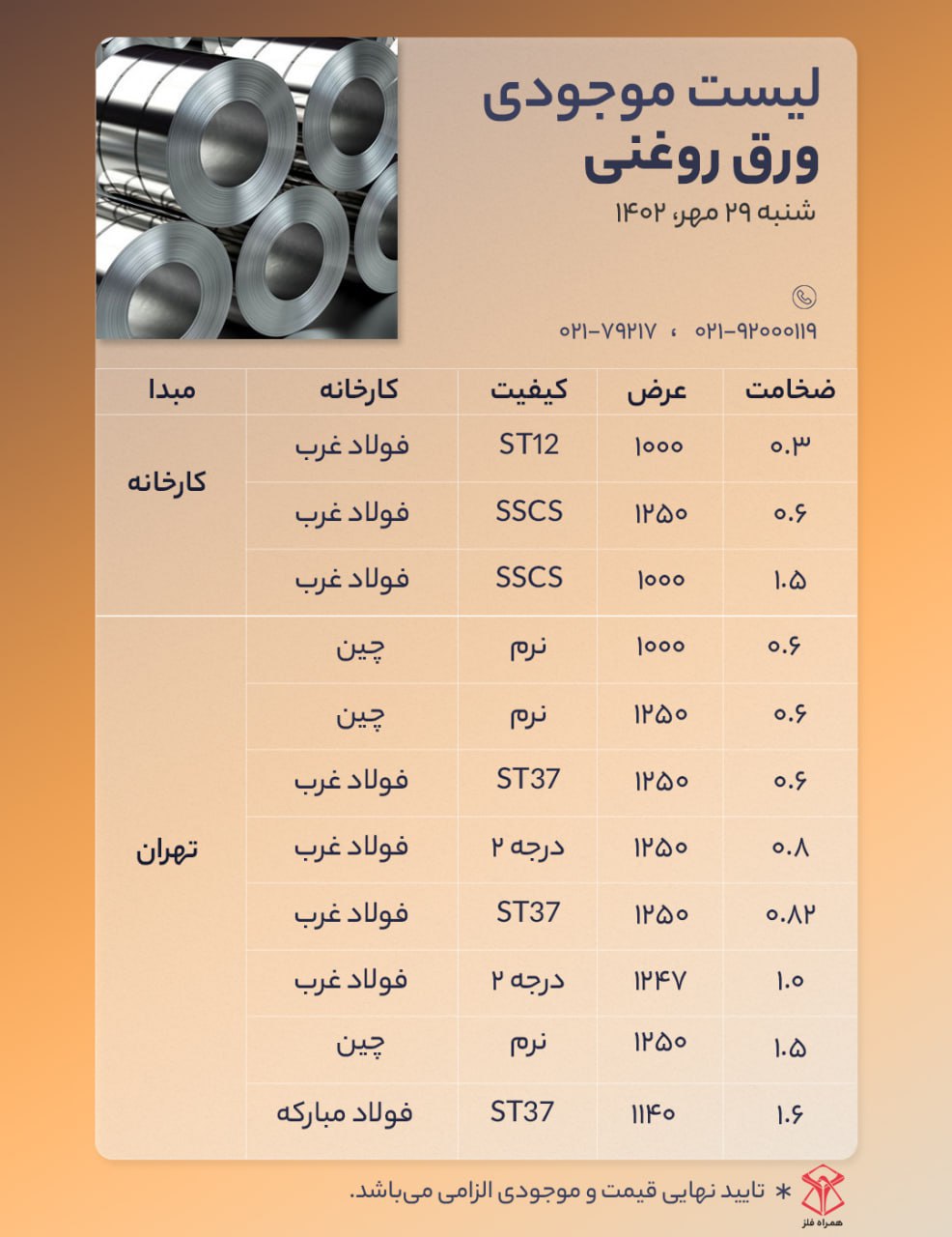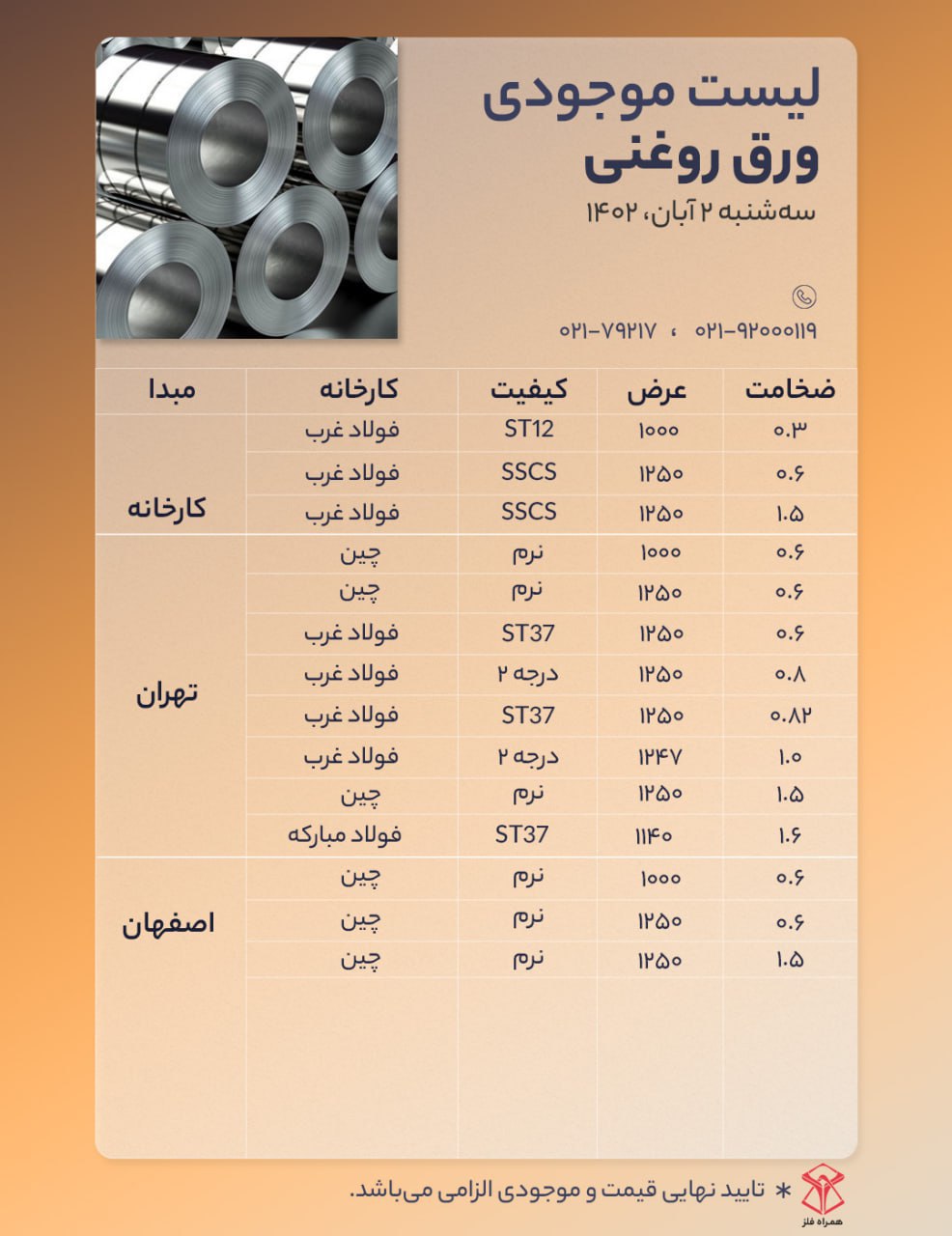 📆سه شنبه 2 آبان ماه 1402 *شرکت همراه فلز آسیا* ✅موجودی ورق روغنی، فولاد غرب 0.6*1000 ST37 0.82*1250 ST37 1.0*1247 درجه 2 0.8*1250 درجه 2 ✅موجودی ورق روغنی ، ف ...