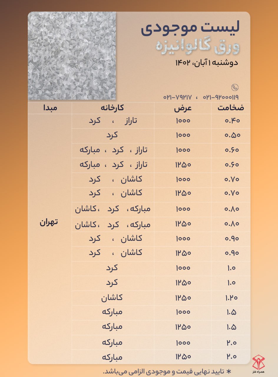 📆سه شنبه 2 آبان ماه 1402 *شرکت همراه فلز آسیا* ✅موجودی ورق گالوانیزه تهران 0.40*1000 درجه یک تاراز 0.40*1000 درجه یک کرد 0.50*1000 درجه یک کرد 0.60*10 ...