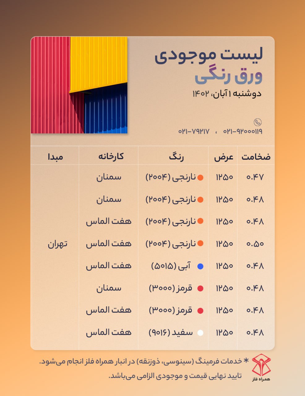 📆دوشنبه 1 آبان ماه 1402 *شرکت همراه فلز آسیا* ✅موجودی ورق رنگی، هفت الماس 0.48*1250 🔵آبی (5015)، 🔴قرمز (3000)، ⚪️سفید (9016)، 🟠نارنجی (2004) 0.50*1250 ...