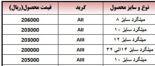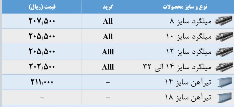 فولاد راد همدانسایز8 👈 216150سایز 10 👈 213650 سایز12 👈 210150سایز14 👈 209150سایز16 👈 209150سایز18 👈 209150سایز20 👈 209150سایز22 ...