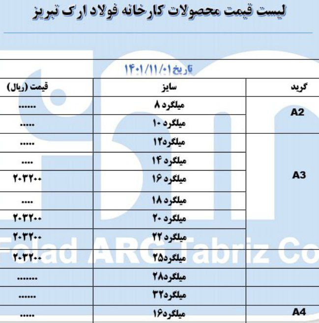 آذرفولادامین تیکمه داشمیلگرد آجدار A3 سایز 10 : ——- میلگرد آجدار A2 سایز 8 : 216000 میلگرد آجدار A2 سایز10: 214000 میلگرد آجدار A3 سایز 12 : 214000 میلگرد آجدا ...