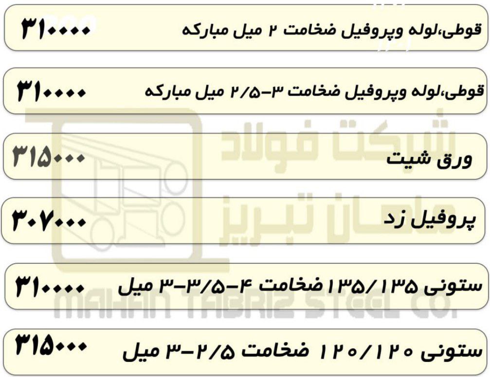 فولاد موحد قیمت قوطی پروفیل 2mگیلان⬅️286000ريالمبارکه⬅️295000ریالورق شیت⬅️310000ریالhttps://t.me/G_F_A_Saba