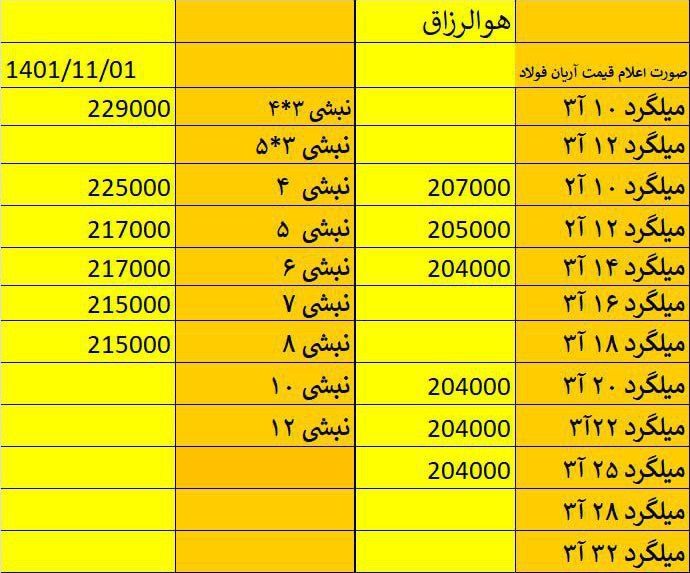 آذرفولادامین تیکمه داشمیلگرد آجدار A3 سایز 10 : ——- میلگرد آجدار A2 سایز 8 : 204000 میلگرد آجدار A2 سایز10: 202000 میلگرد آجدار A3 سایز 12 : 202000 میلگرد آجدا ...