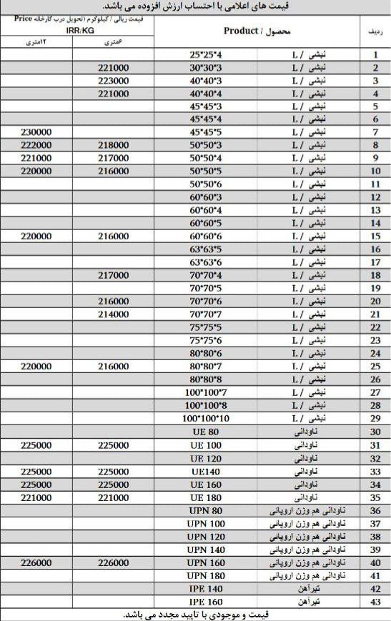 فولاد حسن رود٨شاخه درب كارخانه. ۲١٣٠٠٠ ١٠شاخه درب كارخانه ۲١٠۵۰۰ ١٢ شاخه درب كارخانه. ۲۰۷۵۰۰ ۱۴ شاخه درب كارخانه. ۲۰۴۰۰۰ ١٦ ش ...