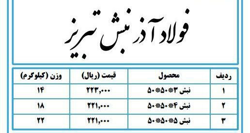 فولاد جاوید بناب 🔹نبشی 40*3 سبک : ۳۰۷۰۰۰ ریال 🔹نبشی 40*3 : ۲۹۵۰۰۰ ریال 🔹نبشی 40*4 سبک : ۲۸۸۱۰۰ ریال 🔹نبشی 40*4 : ...