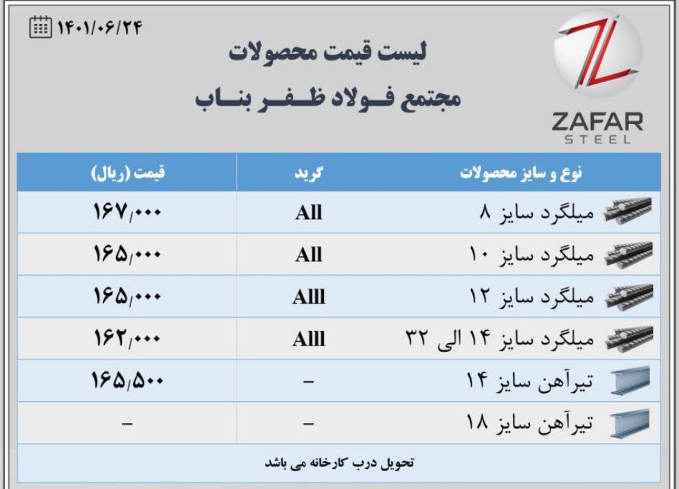 فولاد حسن رود ٨شاخه درب كارخانه. ۱۶۸۰۰۰ ١٠شاخه درب كارخانه ۱۶۳۰۰۰ ١٢ شاخه درب كارخانه. ۱۶۰۰۰۰ ۱۴ شاخه درب كارخانه. ۱۵۸۰۰۰ ...