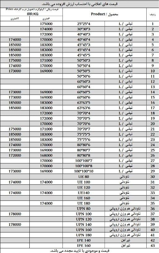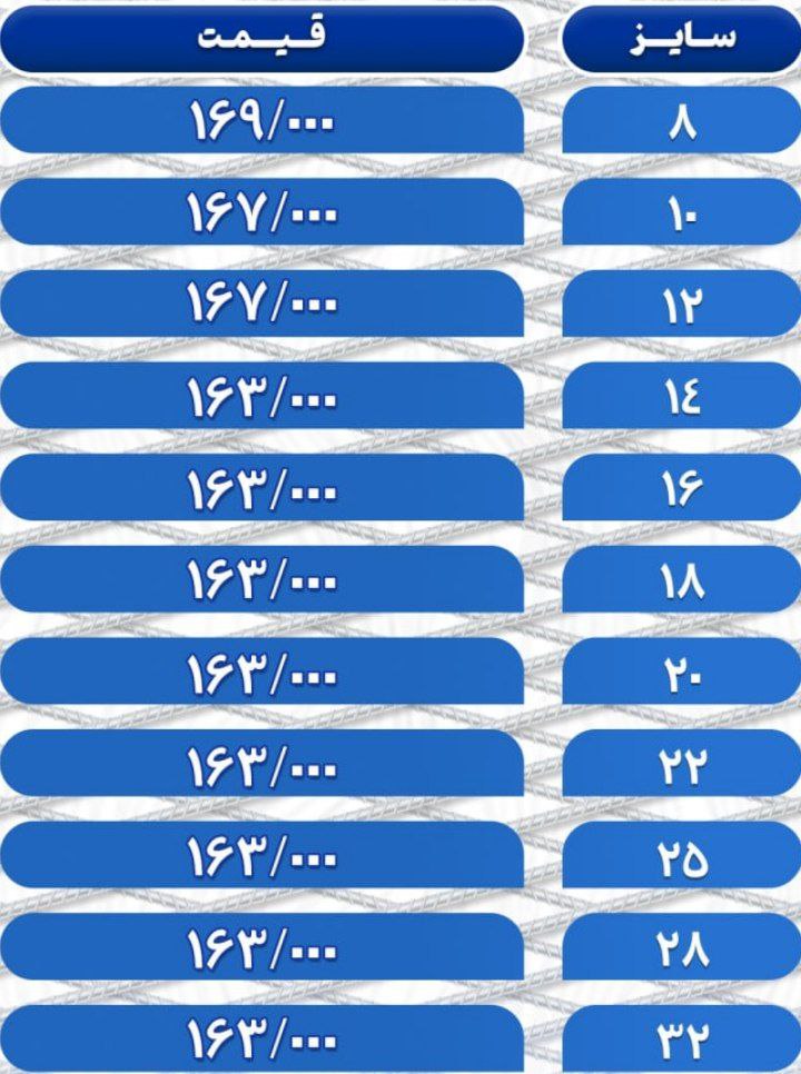فولاد راد همدان سایز8 👈 174650 سایز 10 👈 172150 سایز12 👈 168650 سایز14 👈 167650 سایز16 👈 167650 سایز18 👈 167650 سایز20 ...