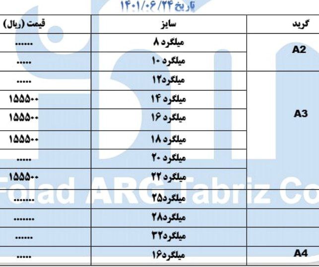 آذرفولادامین تیکمه داش میلگرد آجدار A3 سایز 10 : 163000 میلگرد آجدار A2 سایز 8 : 163000 میلگرد آجدار A2 سایز10: 162000 میلگرد آجدار A3 سایز 12 : 162000 میلگ ...