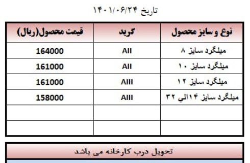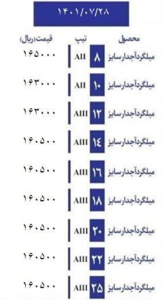 فولاد راد همدان سایز8 👈 174750 سایز 10 👈 172250 سایز12 👈 168750 سایز14 👈 167750 سایز16 👈 167750 سایز18 👈 167750 سایز20 ...