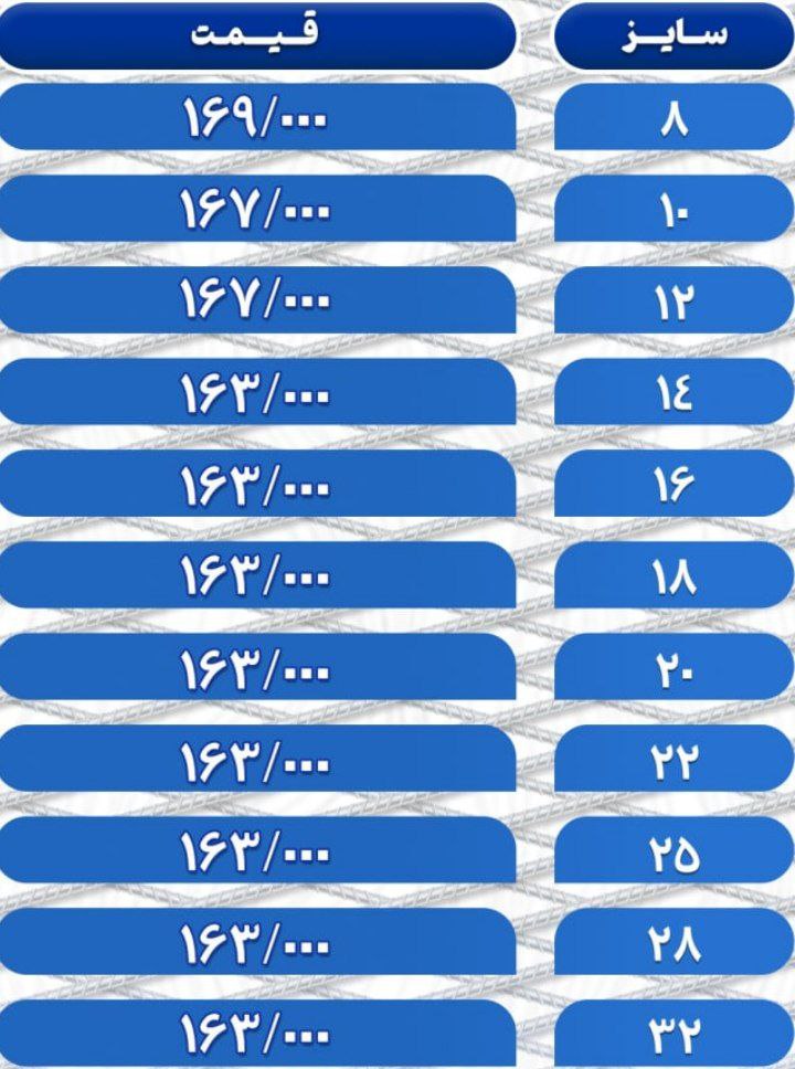 آرمان آسیا سایز 8 👈 163000 سایز 10 👈 156500 سایز 12 👈 156500 سایز 16 👈 156000 سایز 18 👈 156000