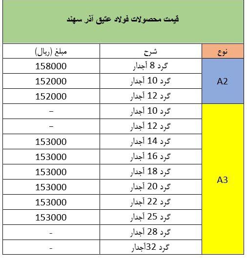 ميلگرد آجدار A2سایز ۸ : ۱۷۸۵۰۰ ميلگرد آجدار A2سايز ١٠ : ۱۶۶۵۰۰ میلگرد آجدار A3 سایز ۱۲: ۱۶۶۵۰۰ میلگر ...