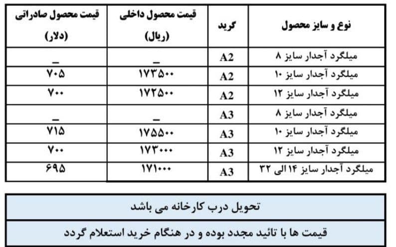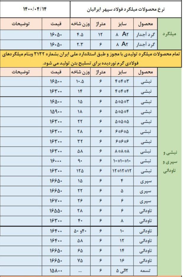 🔸 ميلگرد ٨ آجدار کف استاندارد : ۱۵،۶۰۰تومان 🔸 ميلگرد ۱۰ آجدار کف استاندارد : ۱۵،۵۰۰تومان 🔸 ميلگرد ۱۲ آجدار کف استاندارد : ۱۵،۵۰۰تومان 🔸 ميلگرد ۱۴ آجدار کف ا ...