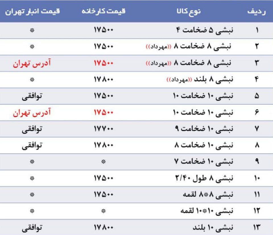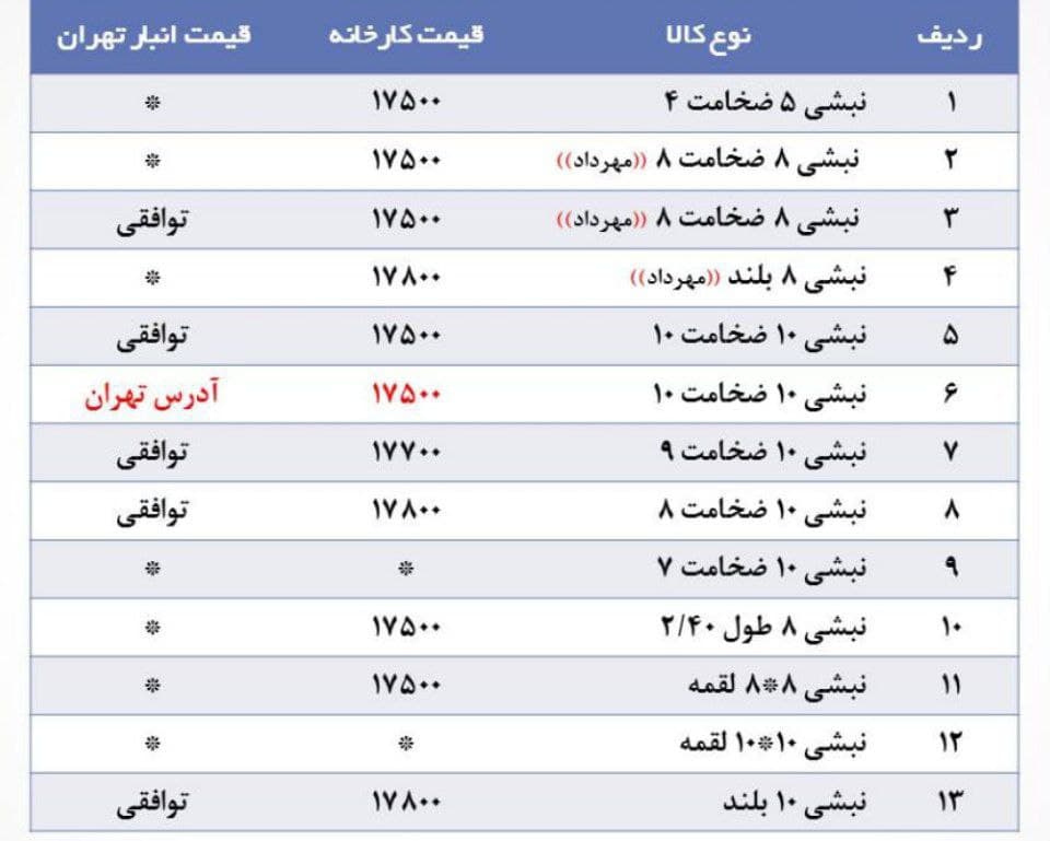 گلستان ميلگرد۱۰ شاخه ۱۷۵۰۰۰ ميلگرد١٢ شاخه ۱۷۳۰۰۰ ميلگرد ١٤ شاخه ۱۷۰۰۰۰ میلگرد ۱۸ تا ۲۵ شاخه ۱۶ ...