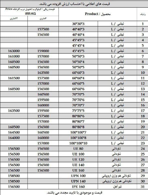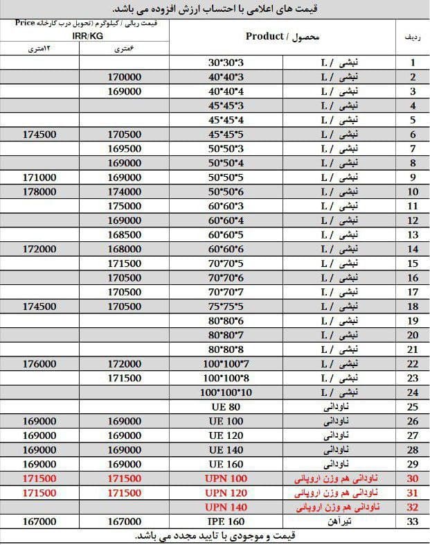 تیرآهن ۱۶ درجه یک قیمت 2/850/000 تومان تیرآهن ۱۶ درجه ۱/۵ قیمت 2/820/000 تومان تیرآهن ۱۸ درجه یک قیمت 3/300/000 تومان تیرآهن ۱۸ درجه ۱/۵ قیمت 3/270/000 توم ...