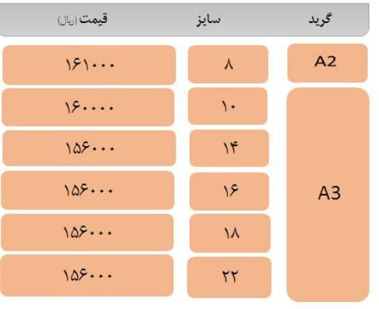 کاوه تیکمه داش گرید A3 سایز 8 : 18,000 گرید A3 سایز 10 :17,800 گرید A2 سایز 8 : 17,800 گرید A2 سایز 10 :17,600 گرید A3 سایز 12 : 17,600 گرید A3 سایز 14 _ 32 : ...