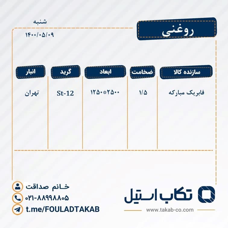 فولاد تکاب 🔴 ورق روغنی بلند فابریک 🔴 ۱/۵ کیفیت st-12 ( فولاد مبارکه ) ۲ کیفیت st-12 ( فولاد مبارکه ) « تحویل تهران » 021-88998805 کارشناسان فروش: آقاي جع ...