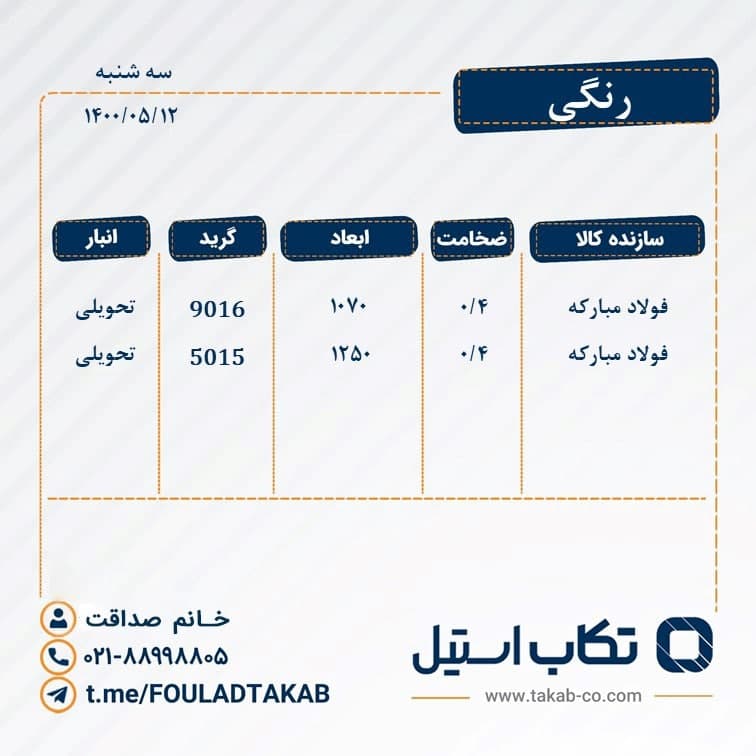 🔴 ورق رنگی فولاد مبارکه 🔴 ۴۰ عرض ١٠٠٠ رال ۹۰۱۶ ۴۰ عرض ۱۰۷۰ رال ۹۰۱۶ ۴۸ عرض ۱۰۷۰ رال ۹۰۱۶ ۴۰ عرض ۱۲۵۰ رال ۵۰۱۵ تحويل تهران 021-88998805 کارشناسان فروش: آق ...