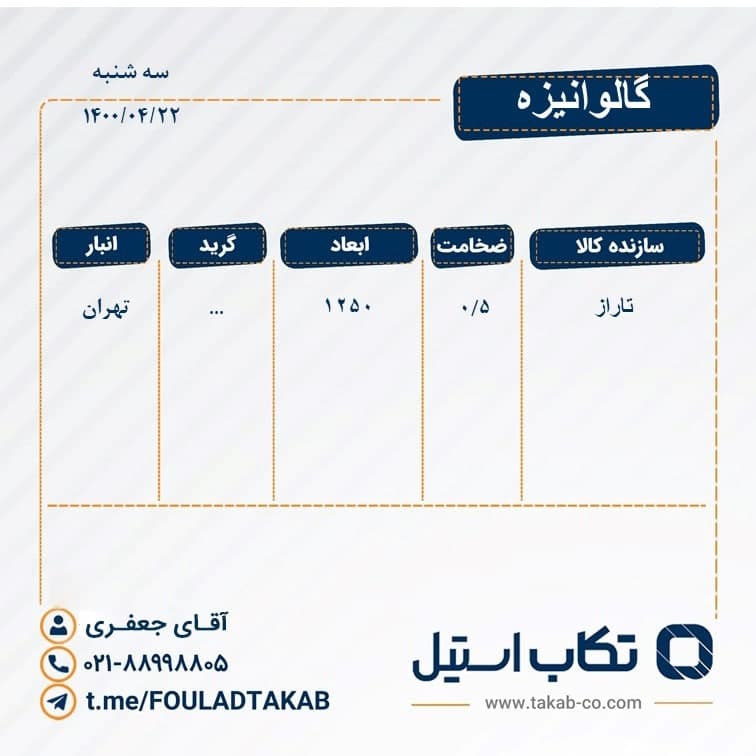 ورق روغنی فولاد تکاب (گروه صنعتی تکاب) محسن اصفهانی "تامین کننده برتر محصولات پایه فولاد در ایران" 📱 ۰۹۱۲۱۲۵۶۱۶۰ ☎️ ۰۲۱۸۸۹۹۸۸۰۵