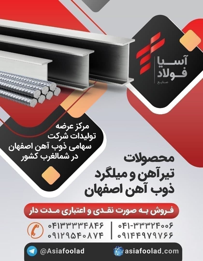 #آسیا_فولاد 🔸مرکز عرضه تولیدات شرکت سهامی ذوب آهن اصفهان در شمالغرب کشور بارگیری مستقیم از اصفهان ⬅️تیرآهن، میلگرد ذوب آهن اصفهان 📱۰۹۹۱۱۴۶۵۷۵۴ 📞 ۳۳۳۳۴۸۴۶- ۰۴ ...