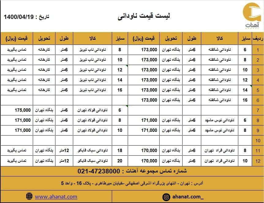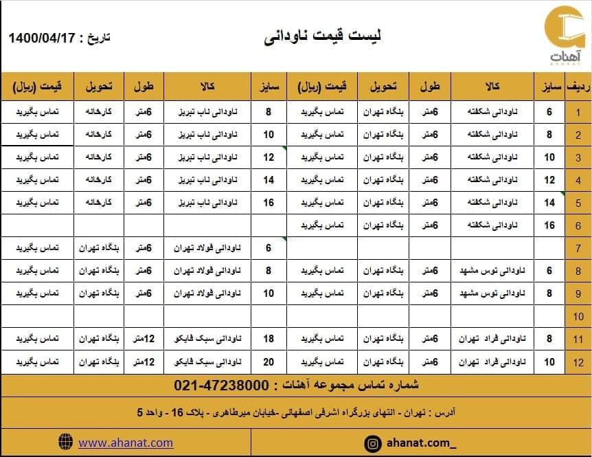 مشخصات و قیمت ناودانی به دلیل نوسانات قیمت جهت اطلاع از تغییرات با کارشناسان ما تماس حاصل فرمایید. ☎️ 021-47238000 📞 09198776648