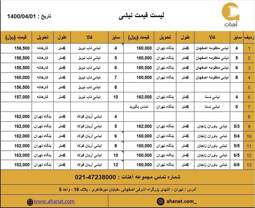 مشخصات و قیمت نبشی به دلیل نوسانات قیمت جهت اطلاع از تغییرات با کارشناسان ما تماس حاصل فرمایید. ☎️ 021-47238000 📞 09198776648