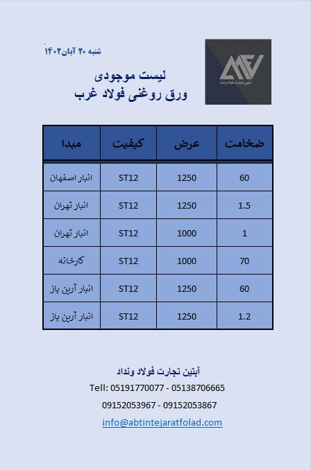 🌃#آبتین_تجارت_فولاد_ونداد ⬅️ توزیع انواع ورق های فولادی از مبادی: 🔸ورق روغنی فولاد غرب آسیا 🔸ورق سیاه گیلان 🔸ورق سیاه مبارکه 🔸ورق گالوانیزه #جهت_مشاهده_پروفایل_ ...