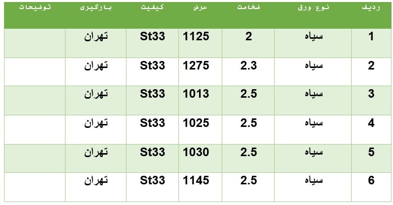 ♦️ورق سیاه گیلان🔸 ————————————-————— 🟡 2/5*1000 🟡 3/5*1000 🟡 6*1250 🟡 8*1250 🟡 10*1000 🟡 12*1250 مبدا ☎️:021- ...