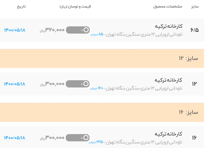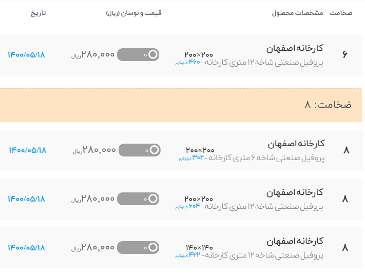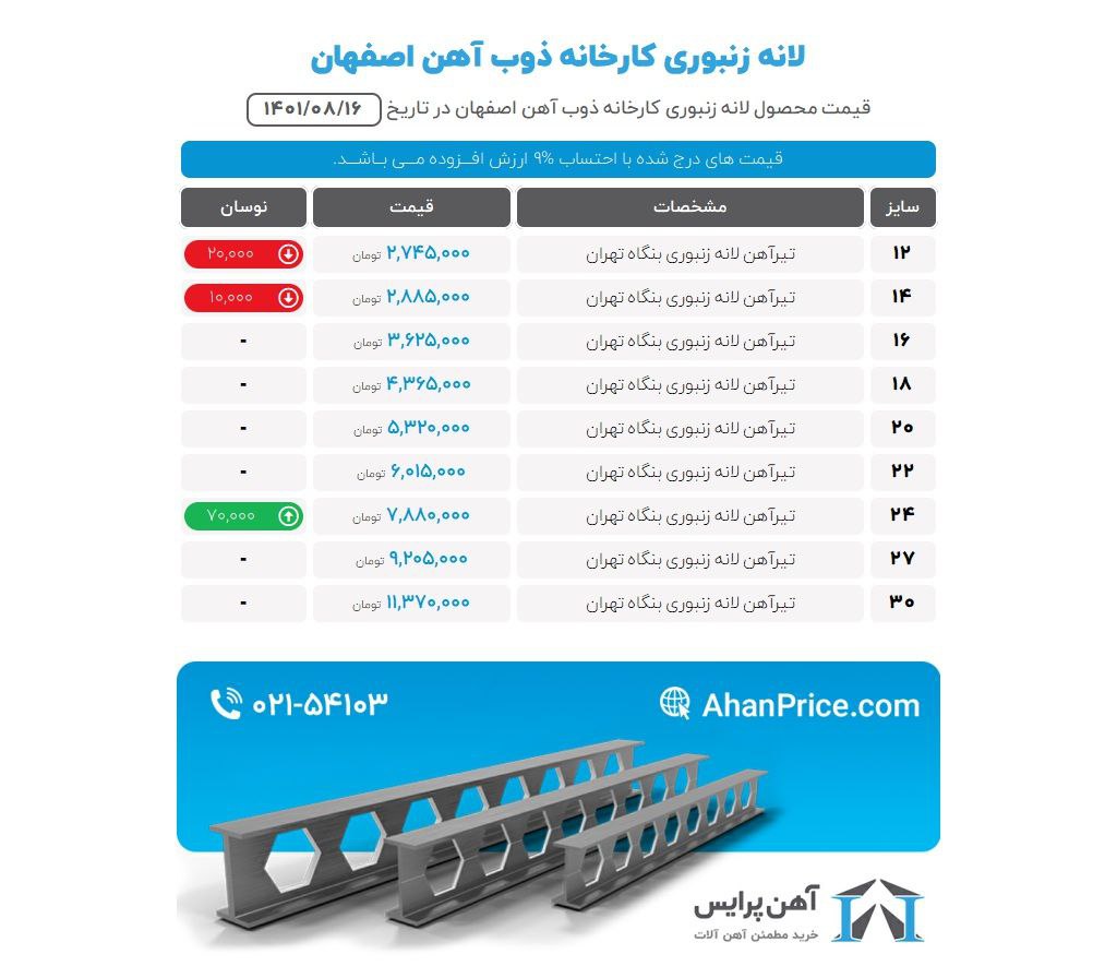 🗓 دوشنبه ۲۰ تیرماه ۱۴۰۱ 🗓 (قیمت ها با احتساب ۹٪ ارزش افزوده میباشد) افزایشی 🔹 تیرآهن ذوب آهن اصفهان دربنگاه تهران سایز۱۲: ۲۳۵۰۰۰۰ سایر۱۴: ۲۹۲۰۰۰۰ سایر۱۶: ...