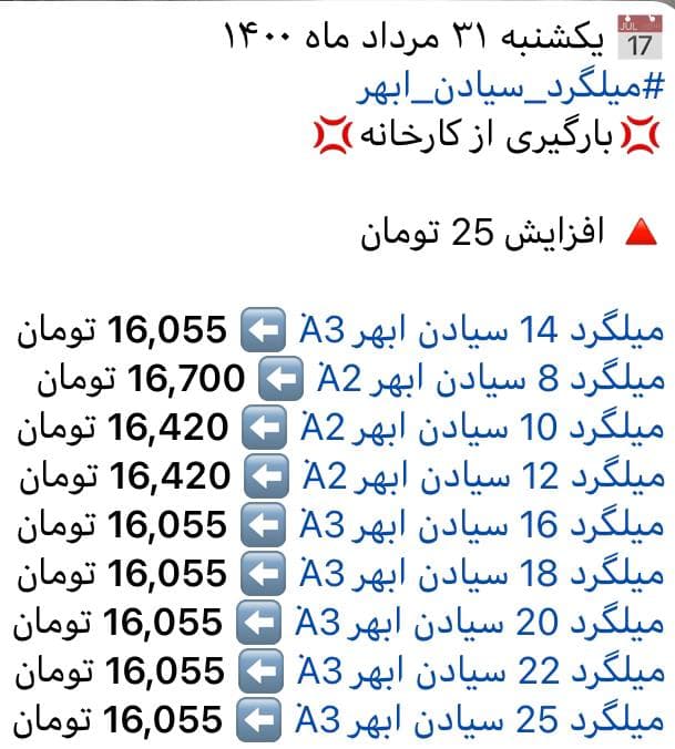 📅 چهارشنبه ۰۳ شهریور ماه ۱۴۰۰ #میلگرد_نیشابور بارگیری از کارخانه 🔻 کاهش 60 تومان میلگرد 12 نیشابور آنالیز A3﮲ ⬅️ 16,120 تومان میلگرد 14 نیشابور آنالیز A3﮲ ⬅️ ...