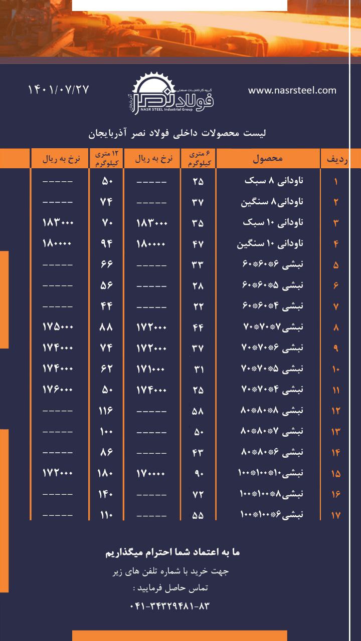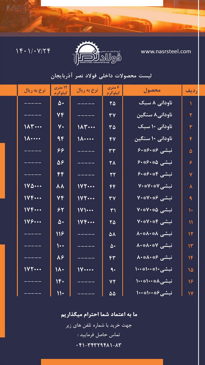 گروه کارخانجات #فولاد_نصر_آذربایجان تولید کننده انواع ناودانی ، نبشی و تیرآهن با استاندارد های روز دنیا صادر کننده نمونه استانی آدرس کارخانه : تبریز ، جاده آ ...