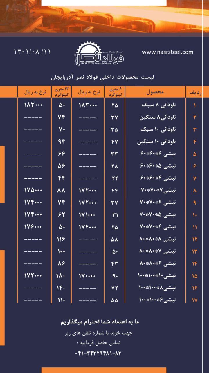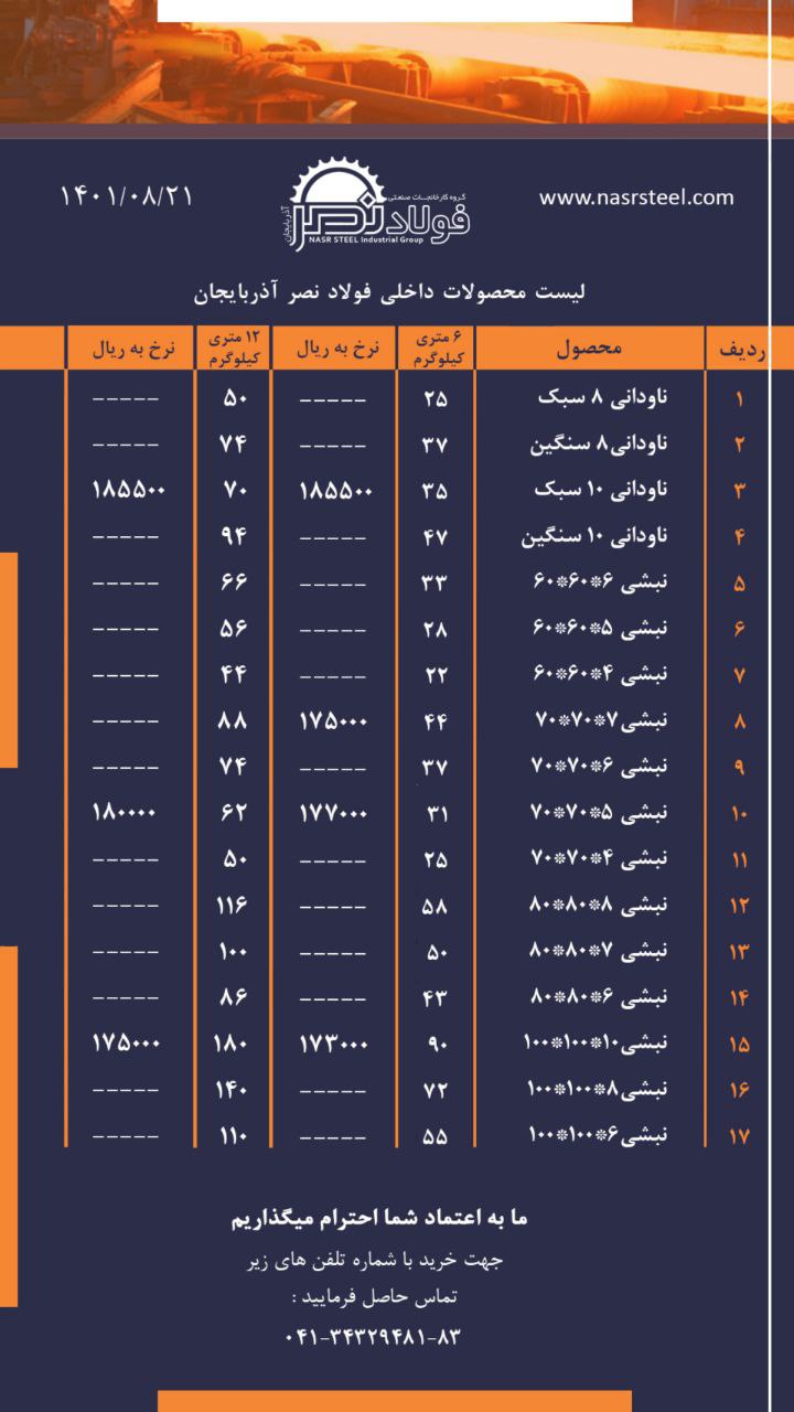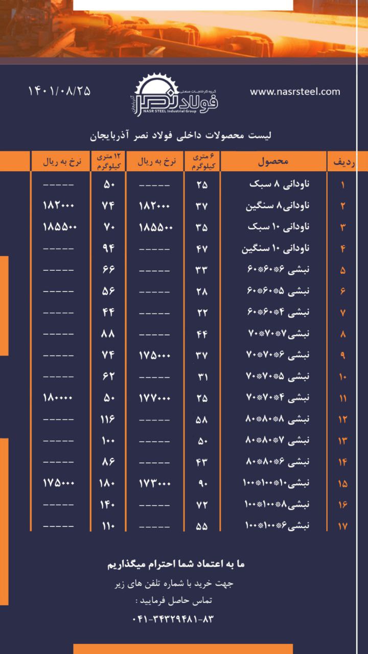 گروه کارخانجات فولاد نصر آذربایجان 📌تولید کننده انواع ناودانی ، نبشی و تیرآهن با استاندارد های روز دنیا 📌صادر کننده نمونه استانی 📍آدرس کارخانه : تبریز ، جاده ...