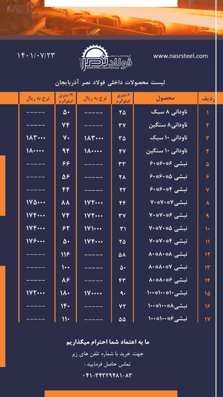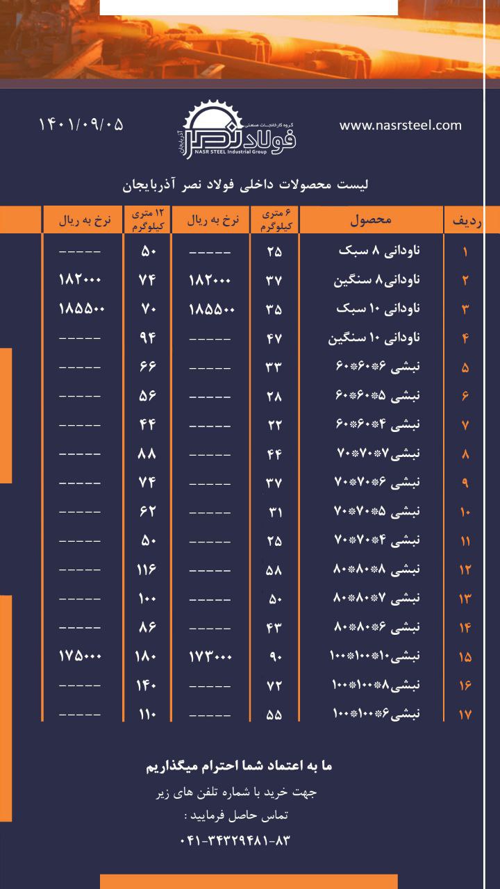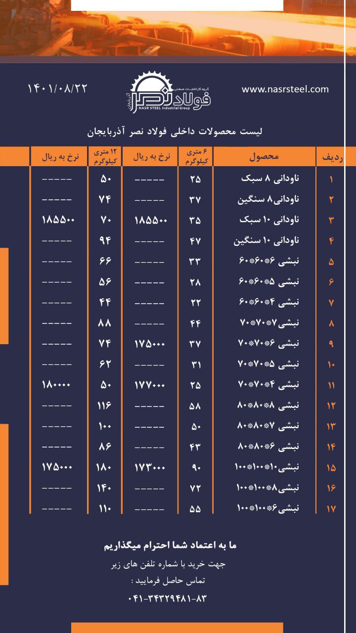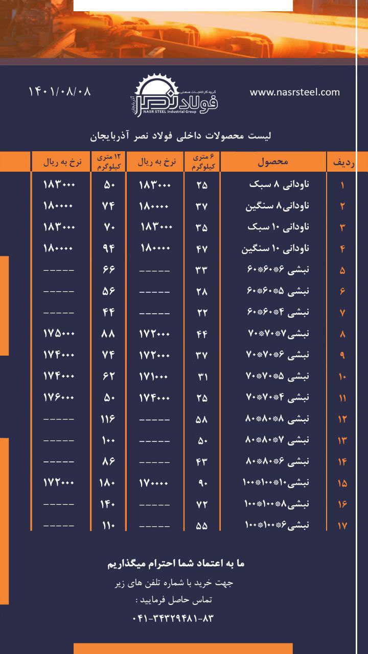 گروه کارخانجات فولاد نصر آذربایجان 📌تولید کننده انواع ناودانی ، نبشی و تیرآهن با استاندارد های روز دنیا 📌صادر کننده نمونه استانی 📍آدرس کارخانه : تبریز ، جاده ...