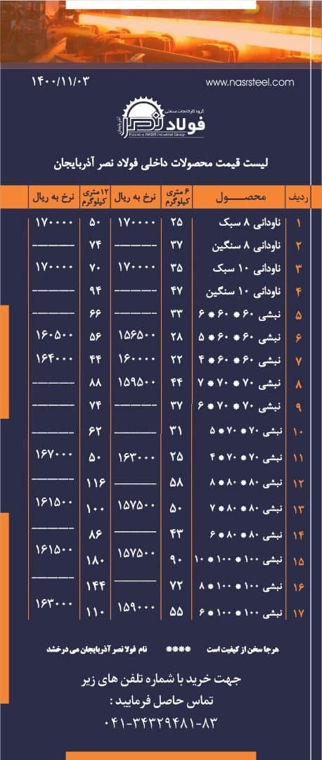 گروه کارخانجات #فولاد_نصر_آذربایجان ⭕️تولید کننده نبشی و ناودانی 👈🏻لیست قیمت محصولات نسبت به آدرس تخلیه شامل تخفیف میباشد. ☎️04134329481 ☎️04134329482 ☎️0413 ...