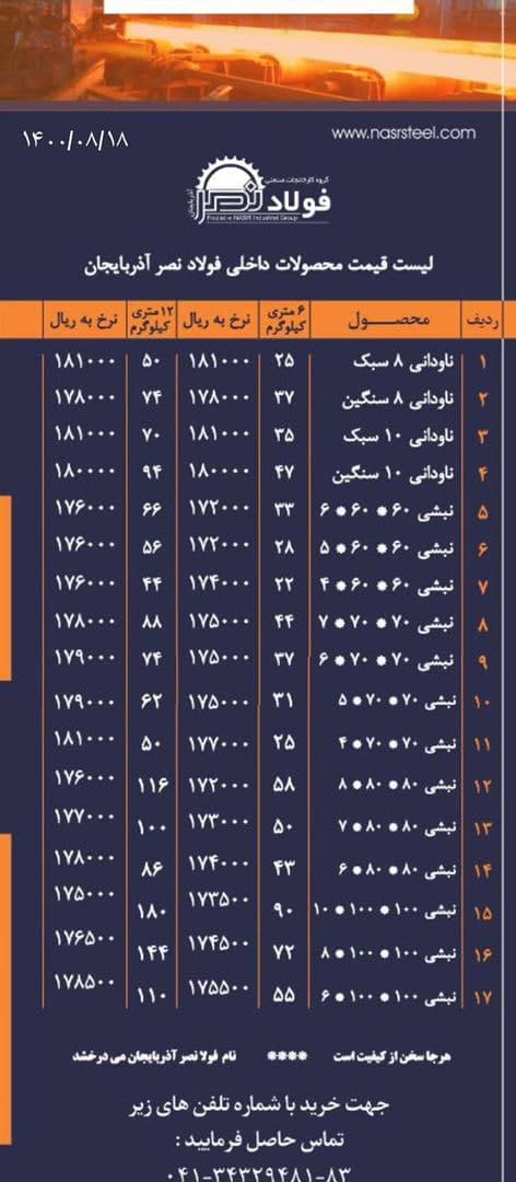 ✅گروه کارخانجات #فولاد_نصر_آذربایجان ⭕️تولید کننده نبشی و ناودانی فوق سبک 👈🏻لیست قیمت محصولات نسبت به آدرس تخلیه شامل تخفیف میباشد. ☎️04134329481 ☎️0413432948 ...