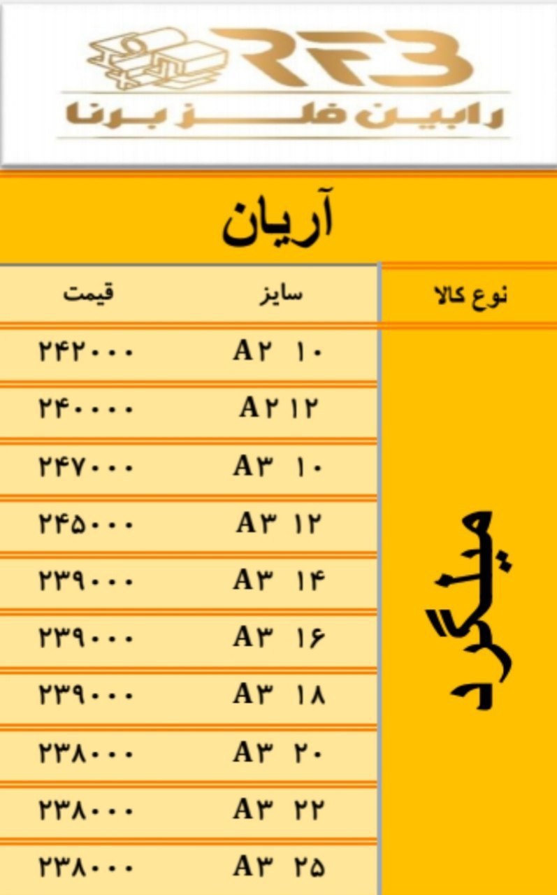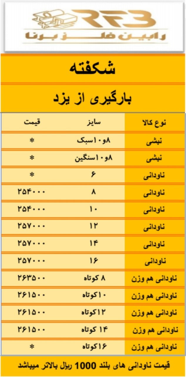 #ضایعاتذوبی 1-روغنی نرمه 16300 2-روغنی ضخیم 16300 3-روغنی ریزبار و پولکی 16300 4-گالوانيزه و ورق روكشدار خودرويي 16200 5-سوپر ويژه 16200 6-كلاف 16150 7-ويژه ...