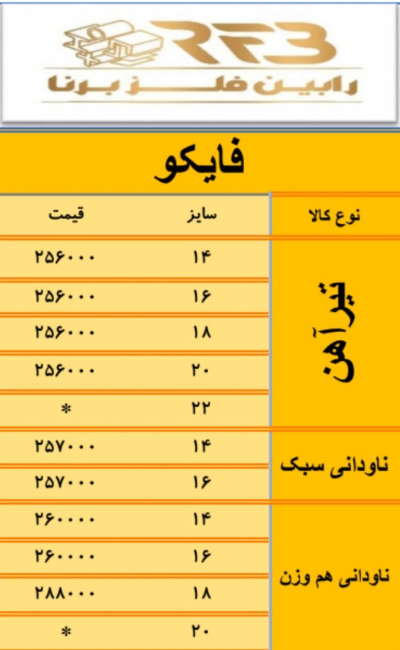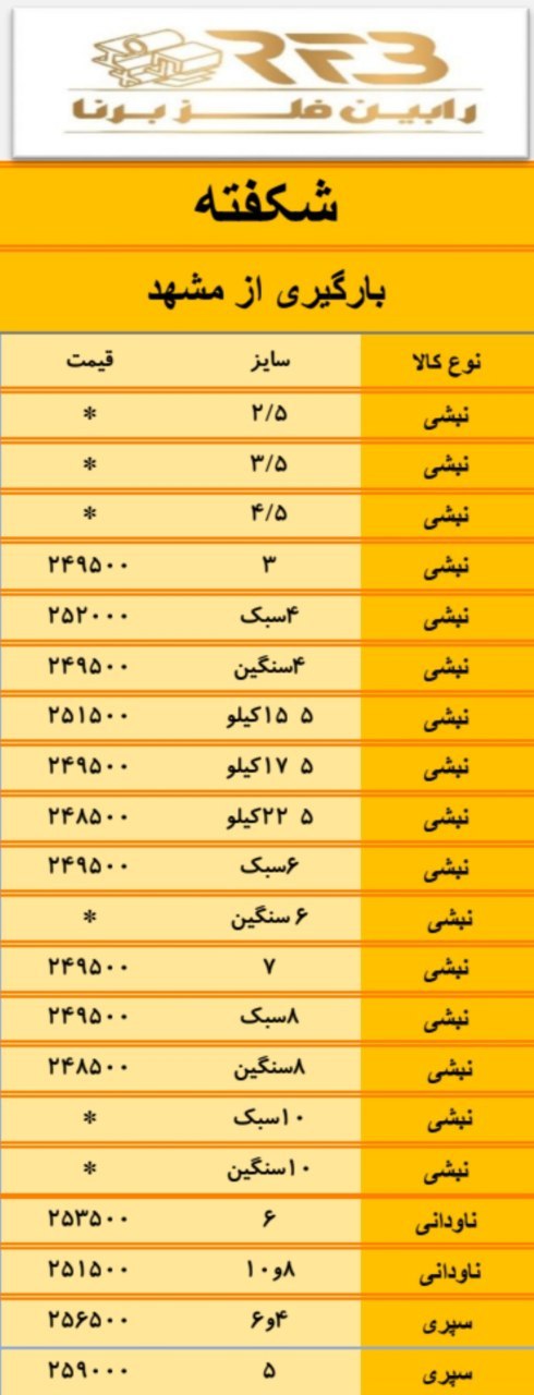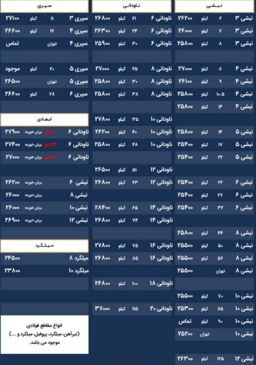 #ضایعاتذوبی 1-روغنی نرمه 15800 2-روغنی ضخیم 15800 3-روغنی ریزبار و پولکی 15800 4-گالوانيزه و ورق روكشدار خودرويي 15700 5-سوپر ويژه 15700 6-كلاف 15650 7-ويژه ...