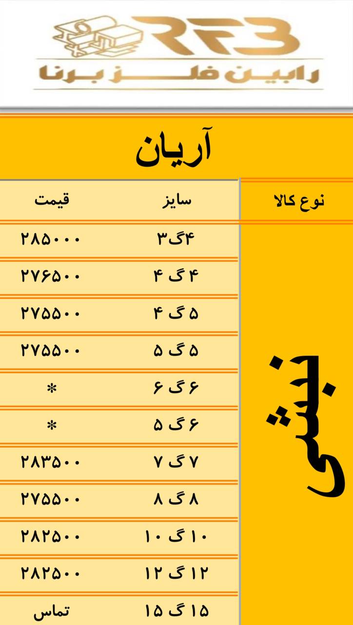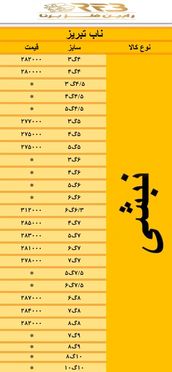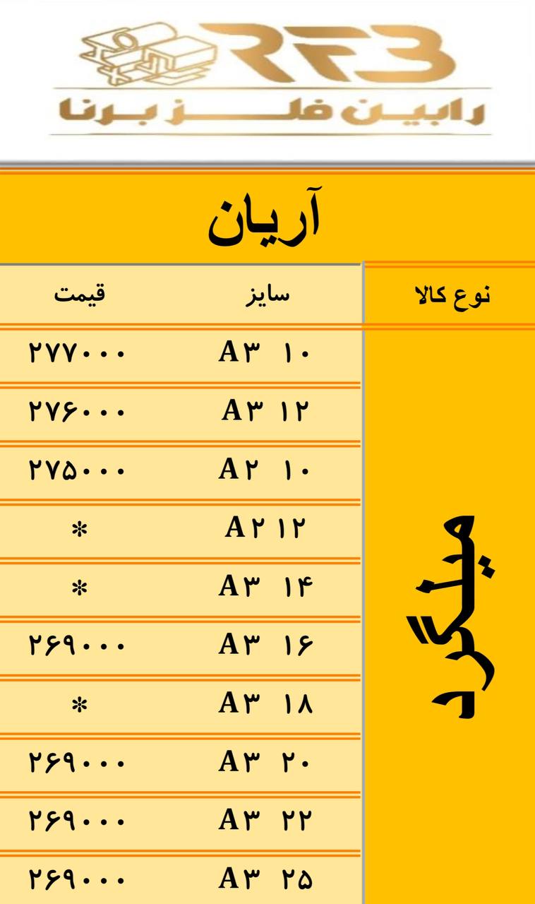 #ضایعات‌ذوبی 1-روغنی نرمه 16900 2-روغنی ضخیم 16900 3-روغنی ریزبار و پولکی 16900 4-گالوانيزه و ورق روكشدار خودرويي 16300 5-سوپر ويژه 16600 6-كلاف 16500 7-وي ...